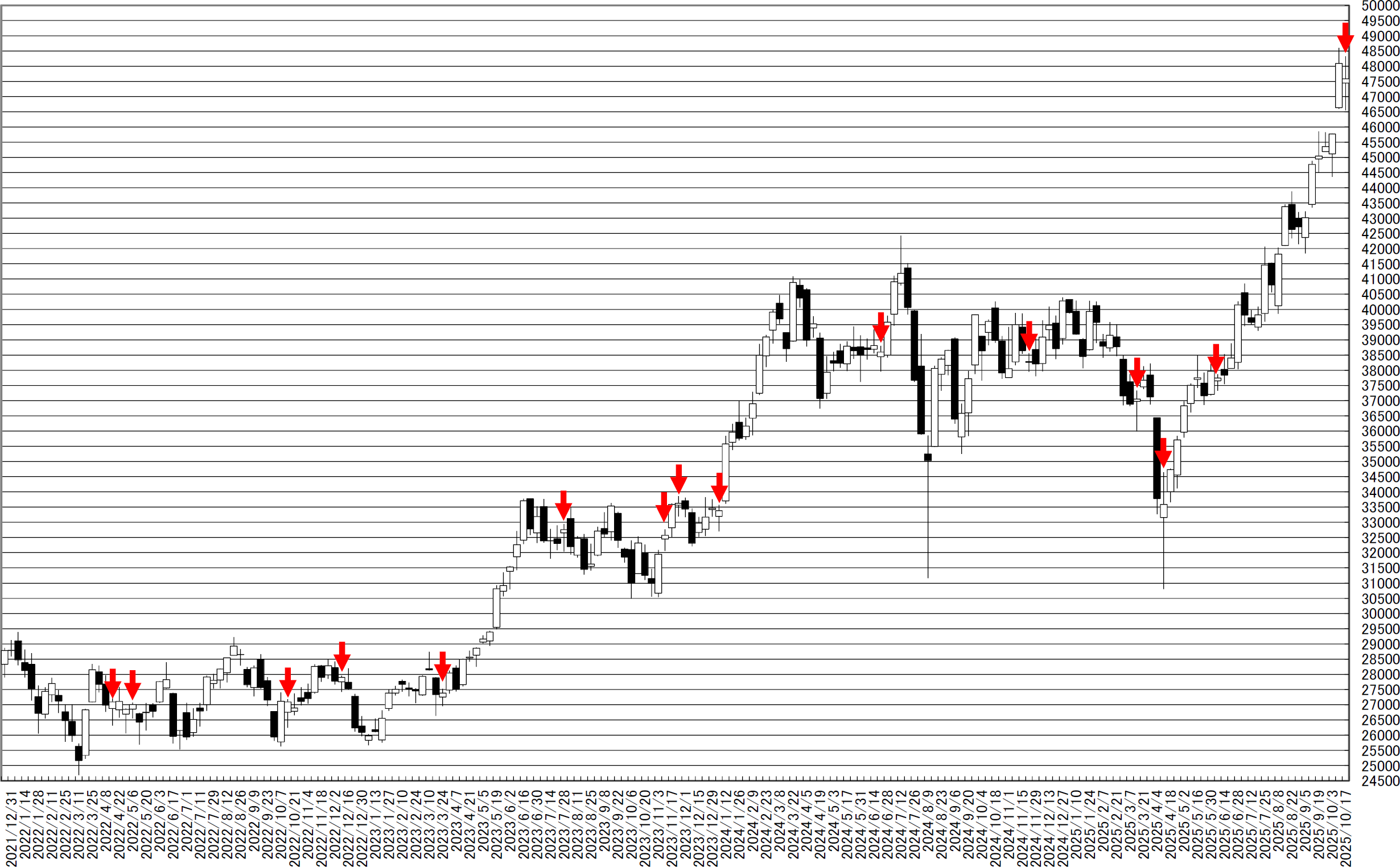 日経平均週足・羽黒3号線・最近の傾向は小動き示唆、ひげ抜きに注目を