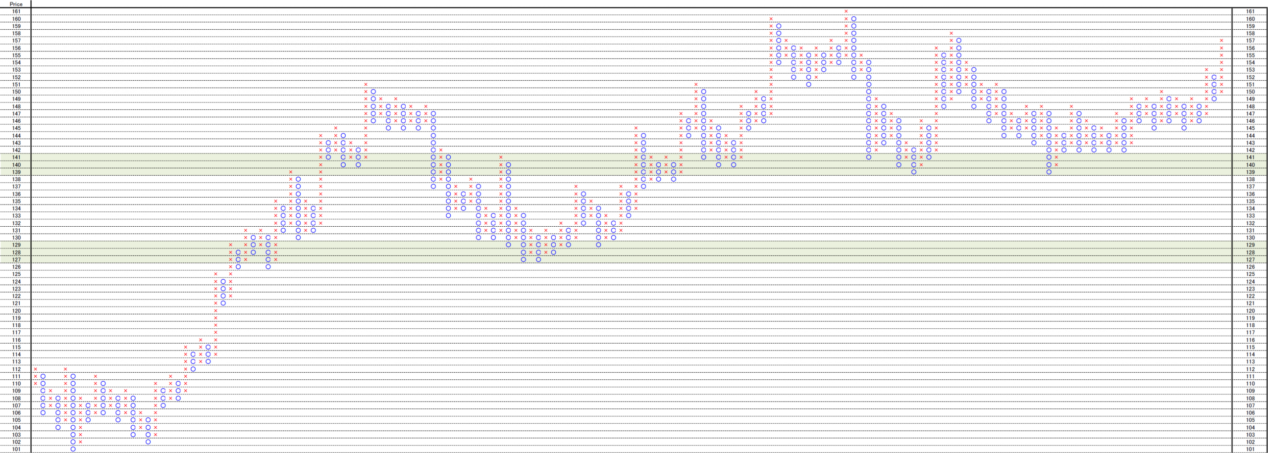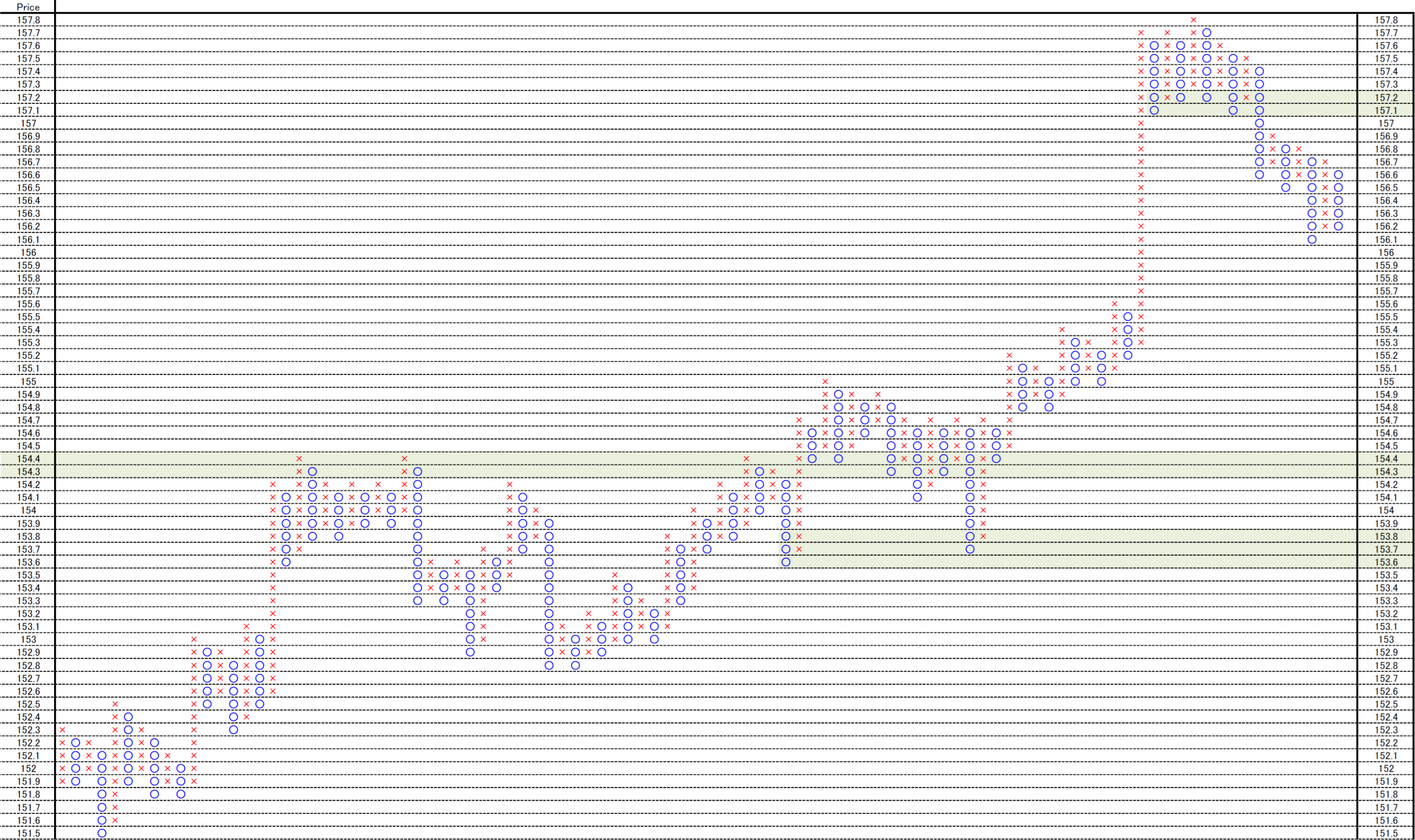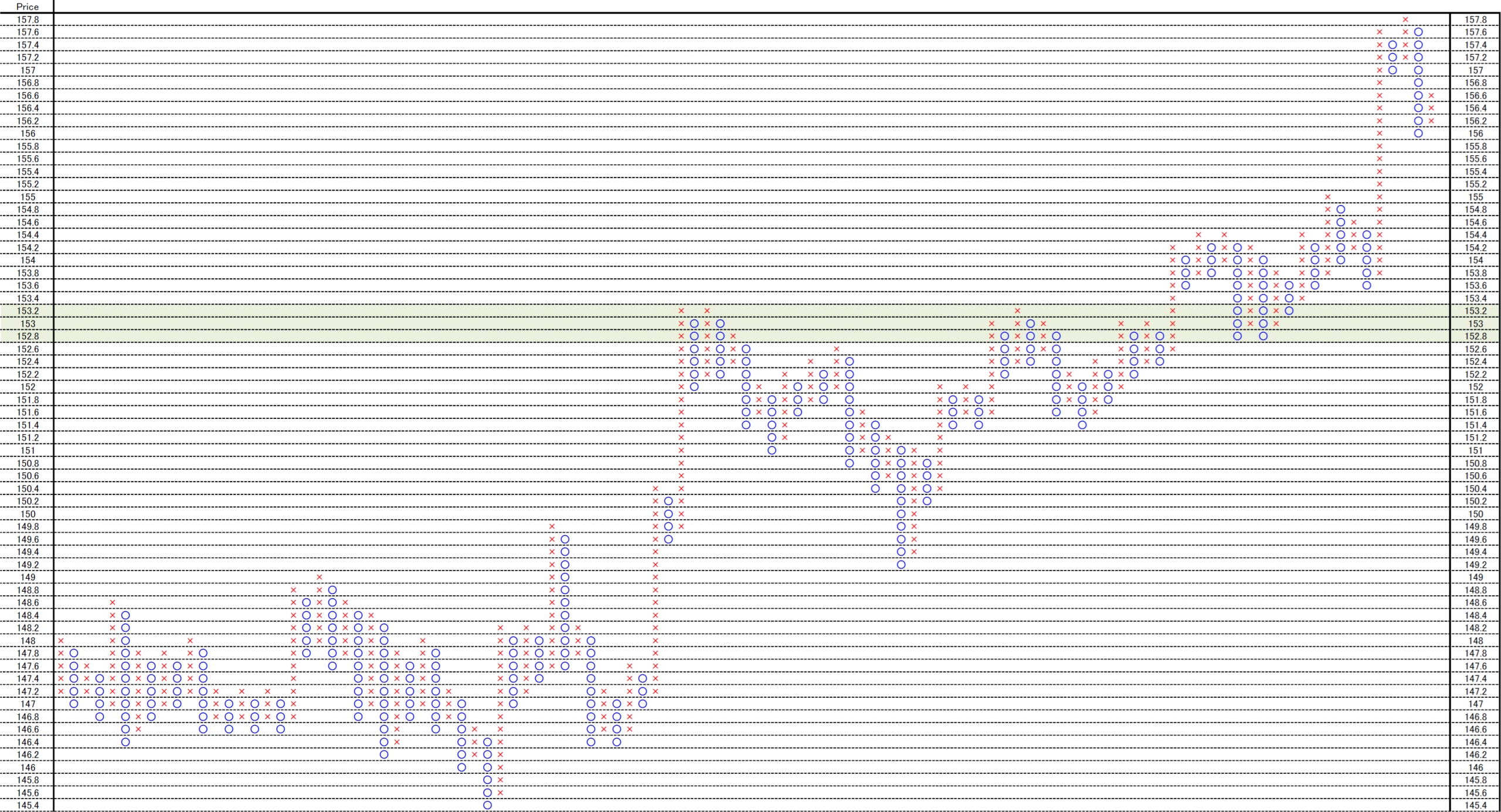 This is 0,1yen, 0.2yen and 1yen price change and 3 box reversal close price’s Point and Figure chart.