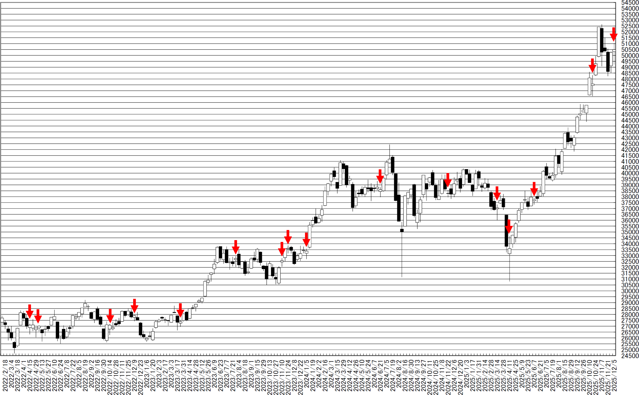 日経平均週足・羽黒3号線・最近の傾向は小動き示唆、ひげ抜きに注目を