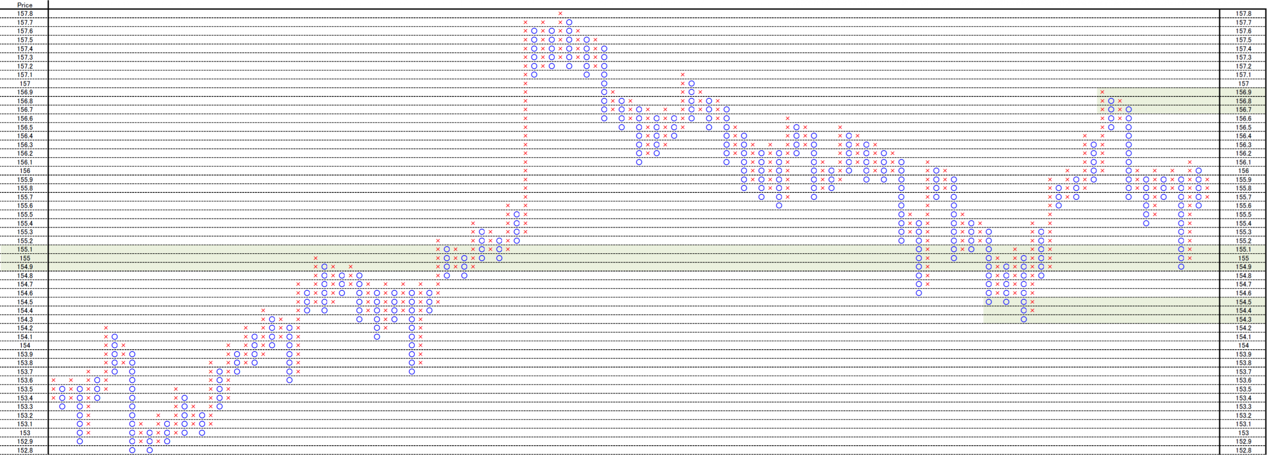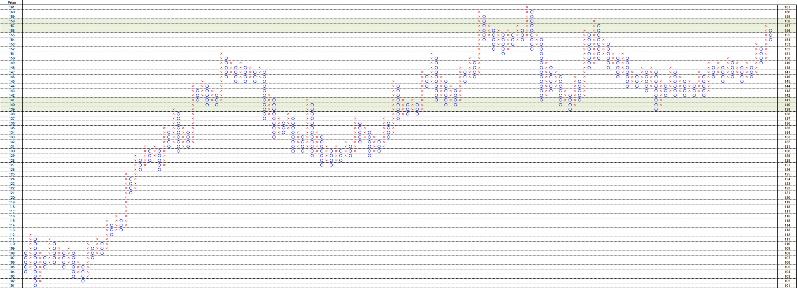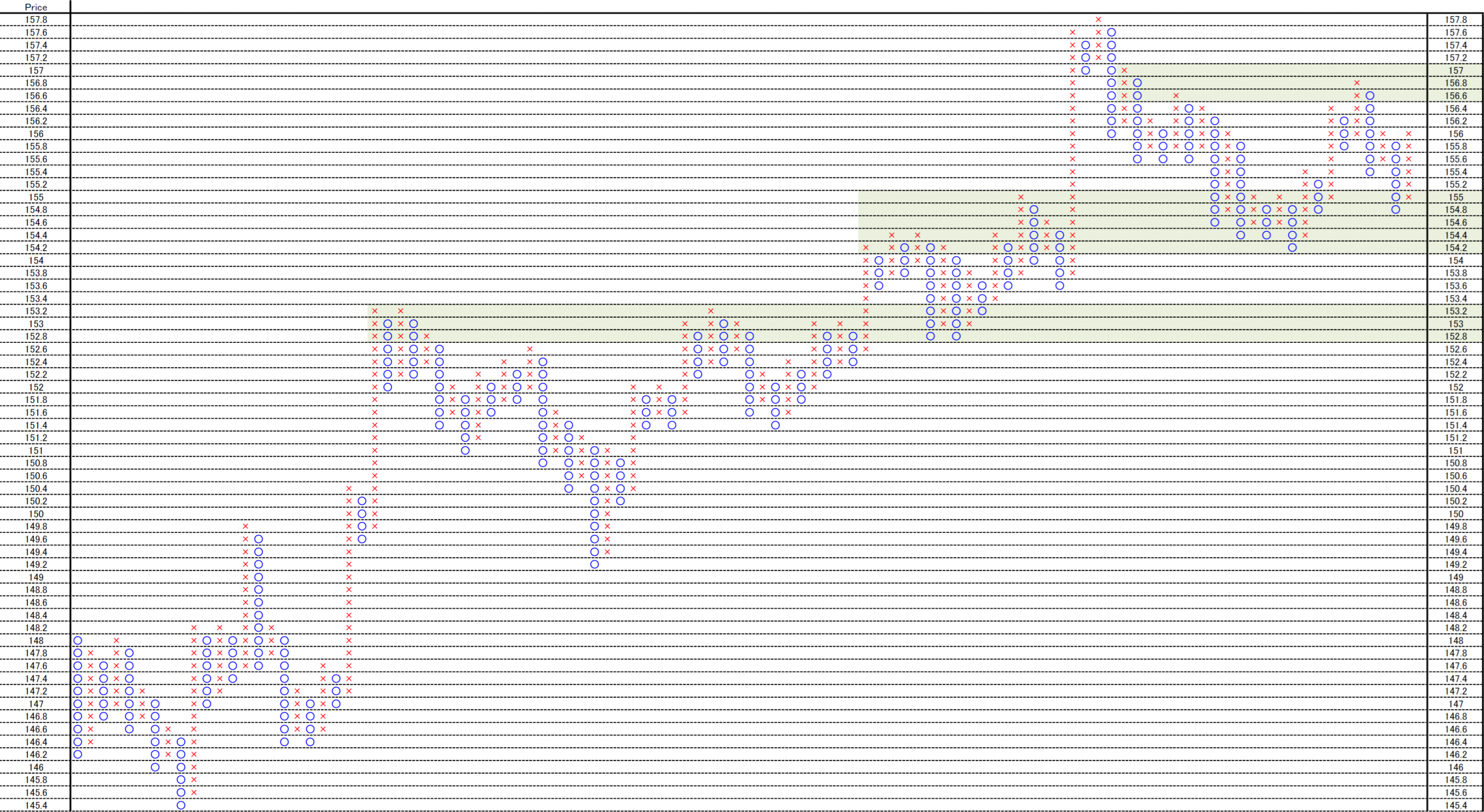 This is 0,1yen, 0.2yen and 1yen price change and 3 box reversal close price’s Point and Figure chart.