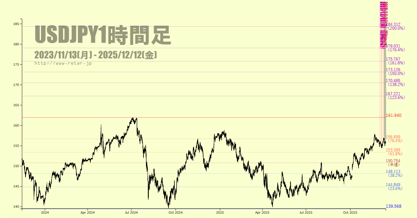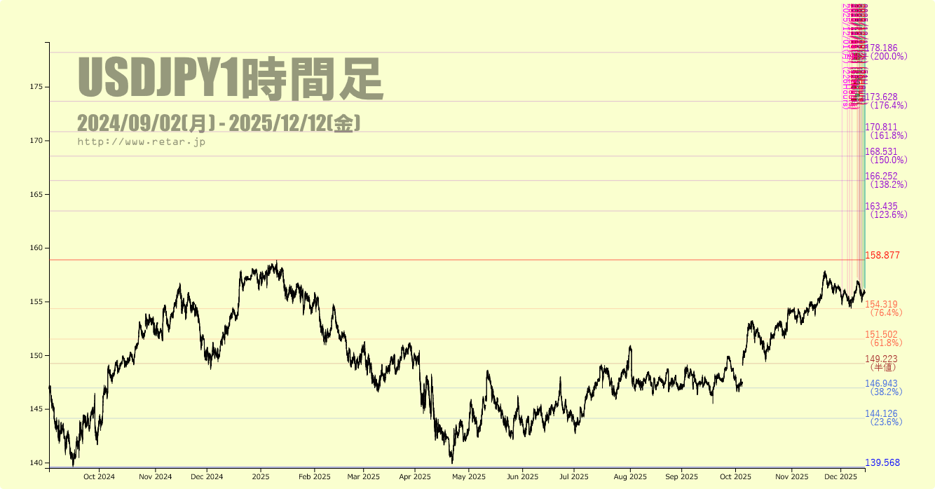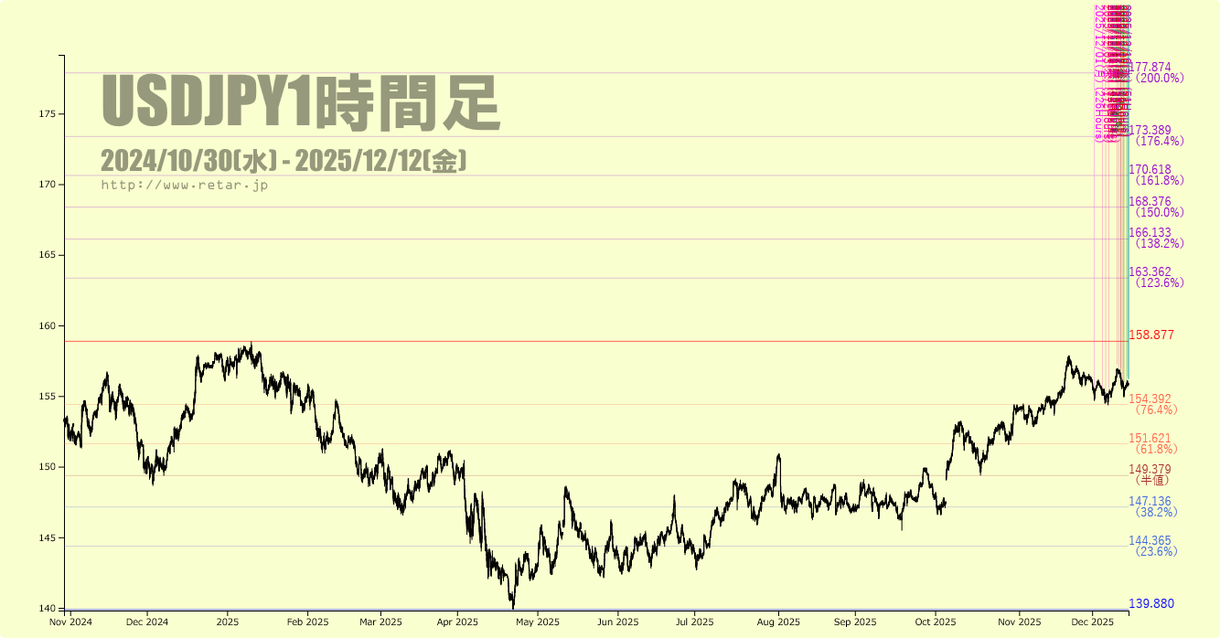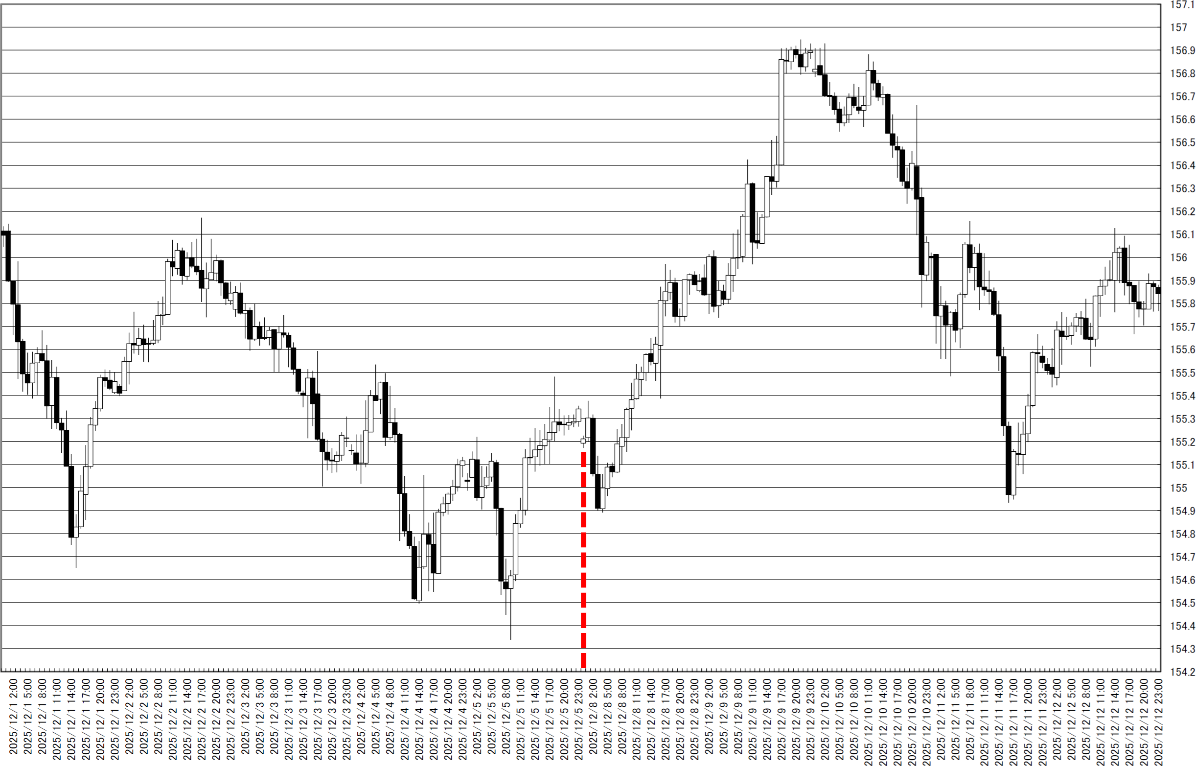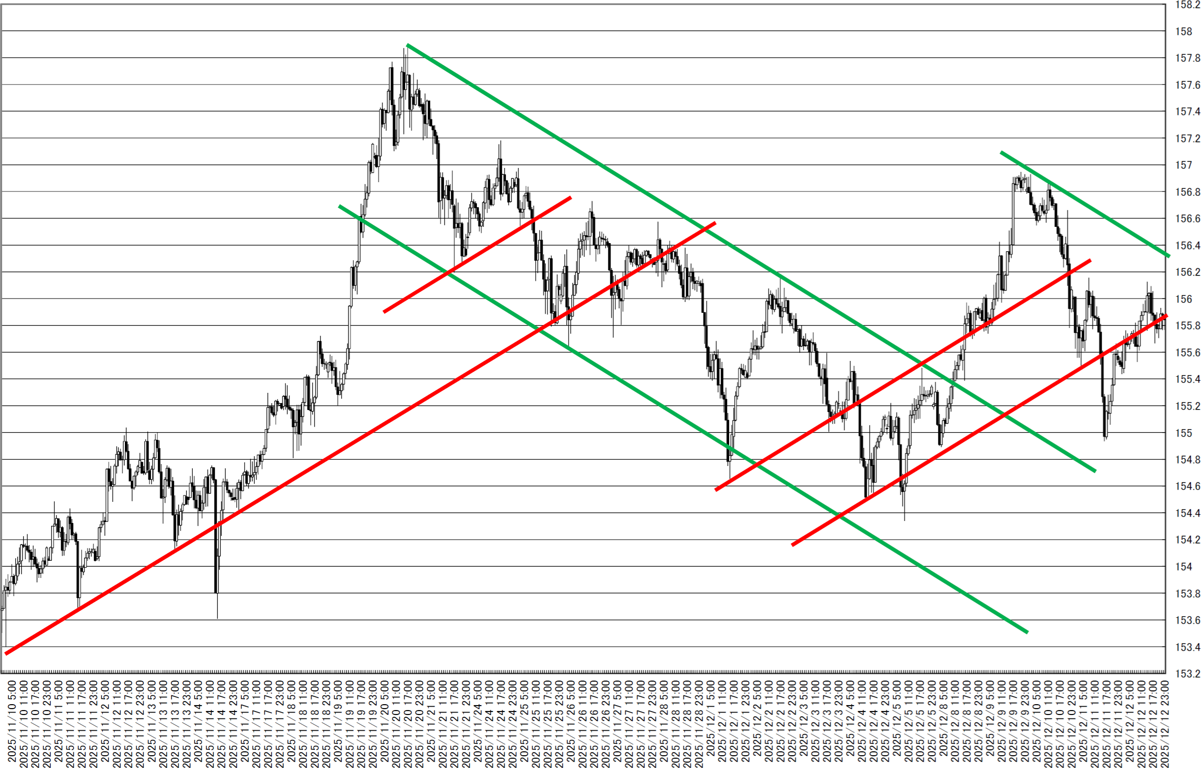 「ドル円1時間足・引き続き、相場の転換点かもしれず読みづらい」(2025/12/8)
