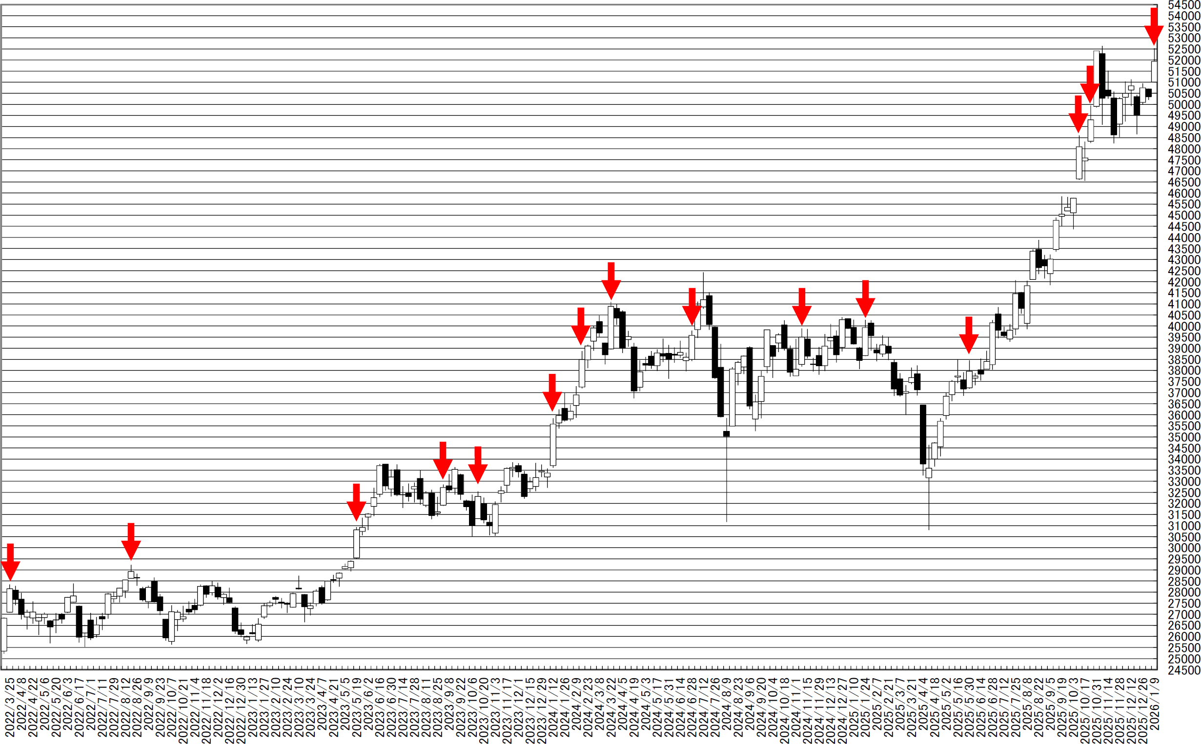 日経平均週足・羽黒5号線・ヒゲ抜きから上値追いでは