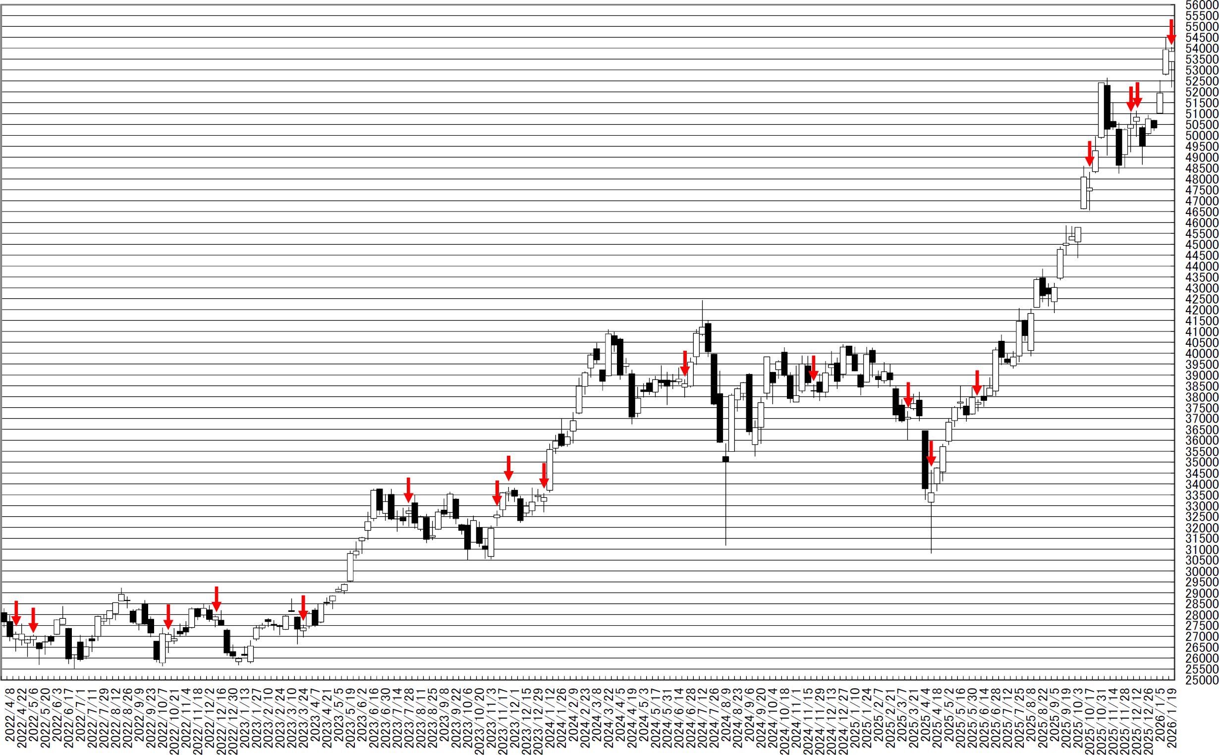 日経平均週足・羽黒3号線・最近の傾向は小動き示唆、ひげ抜きに注目を
