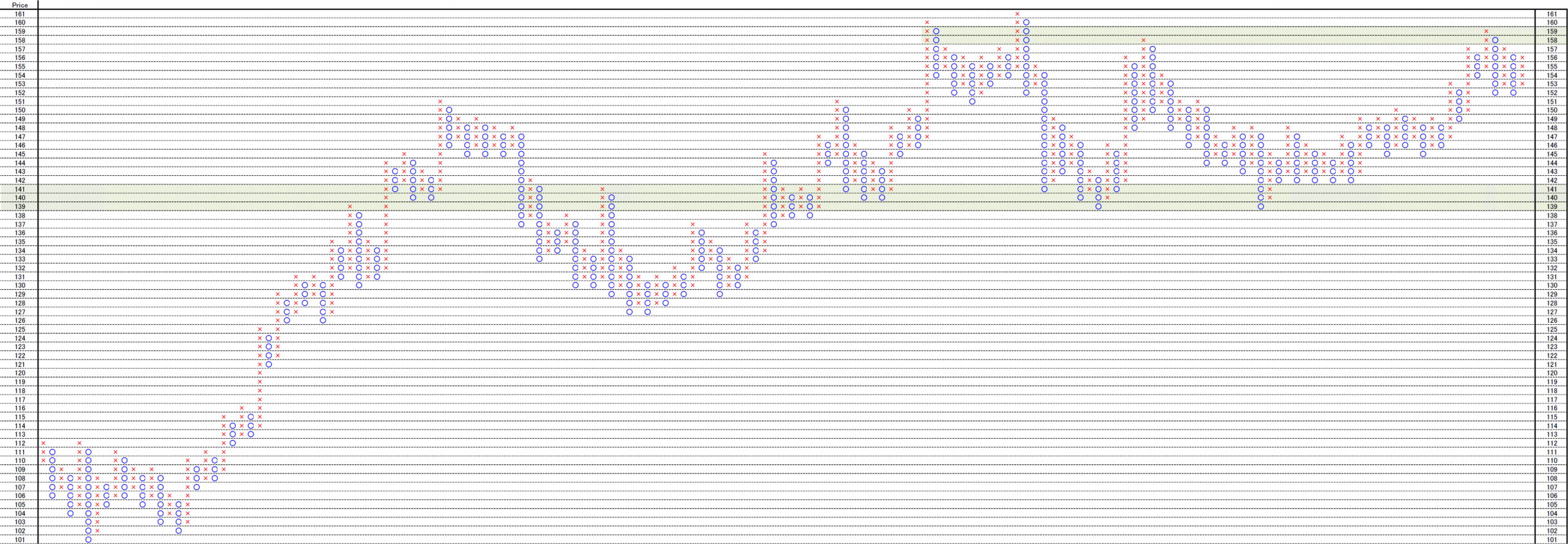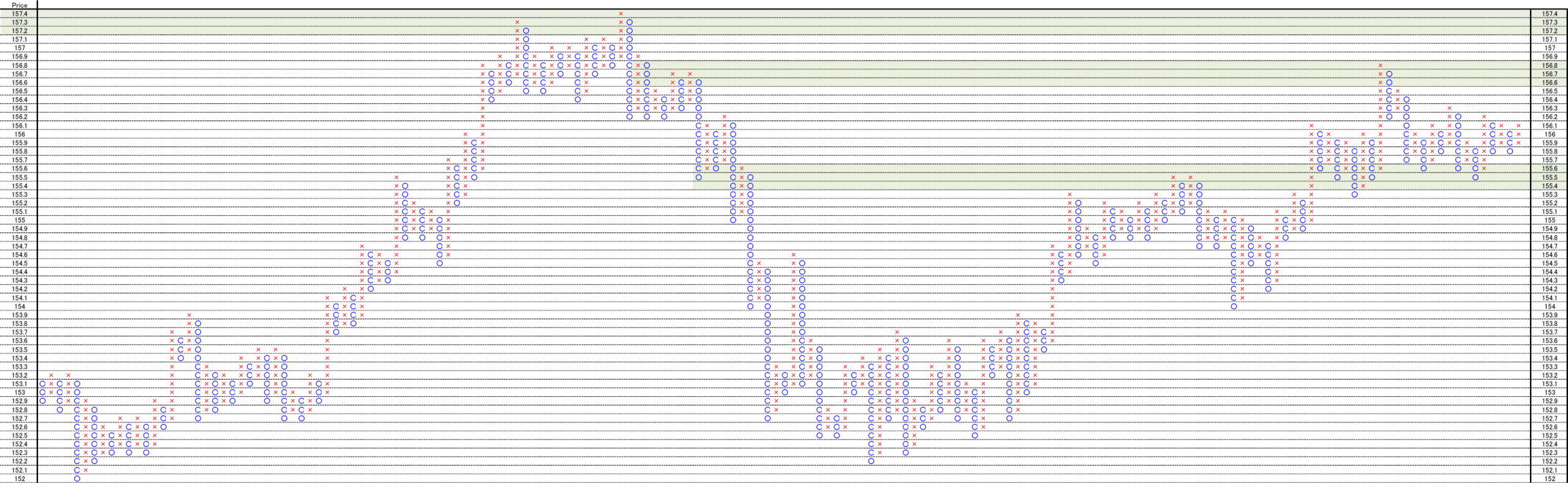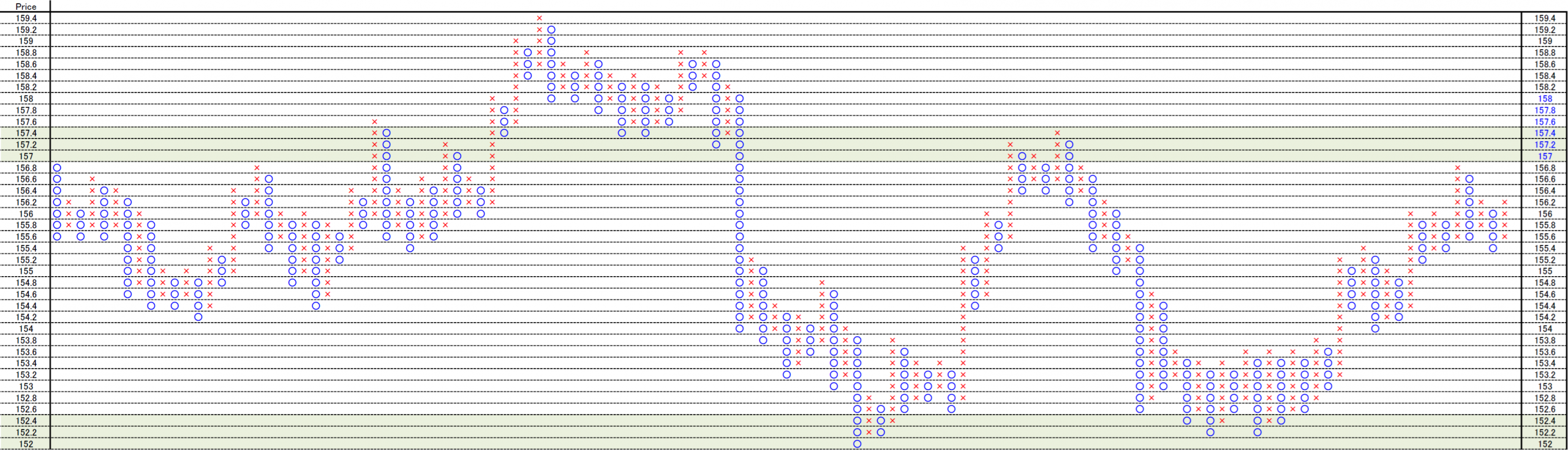 This is 0,1yen, 0.2yen and 1yen price change and 3 box reversal close price’s Point and Figure chart.