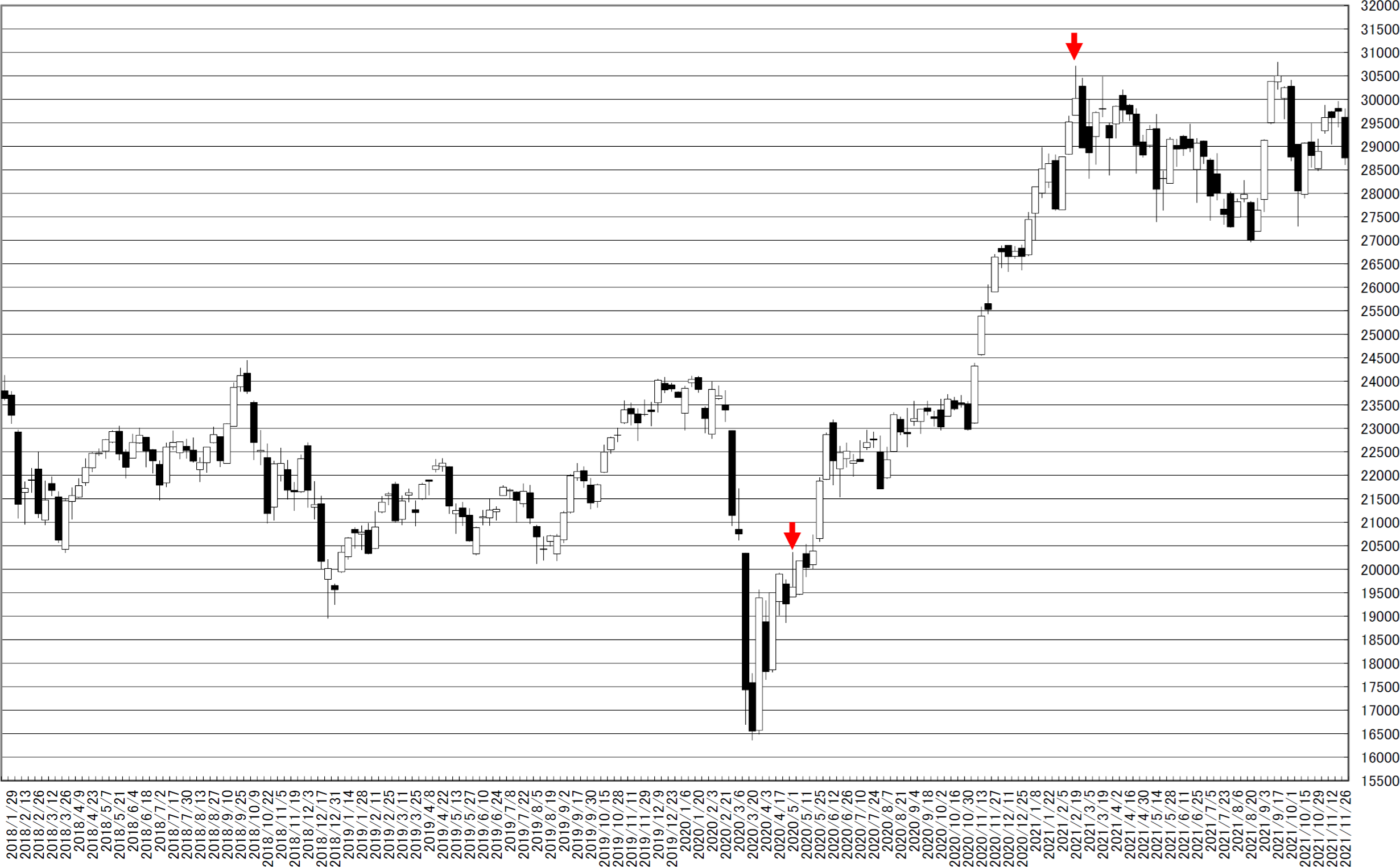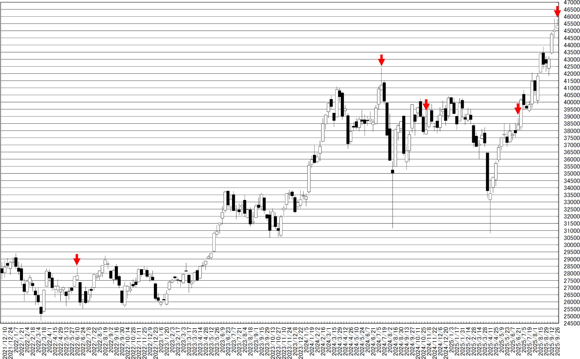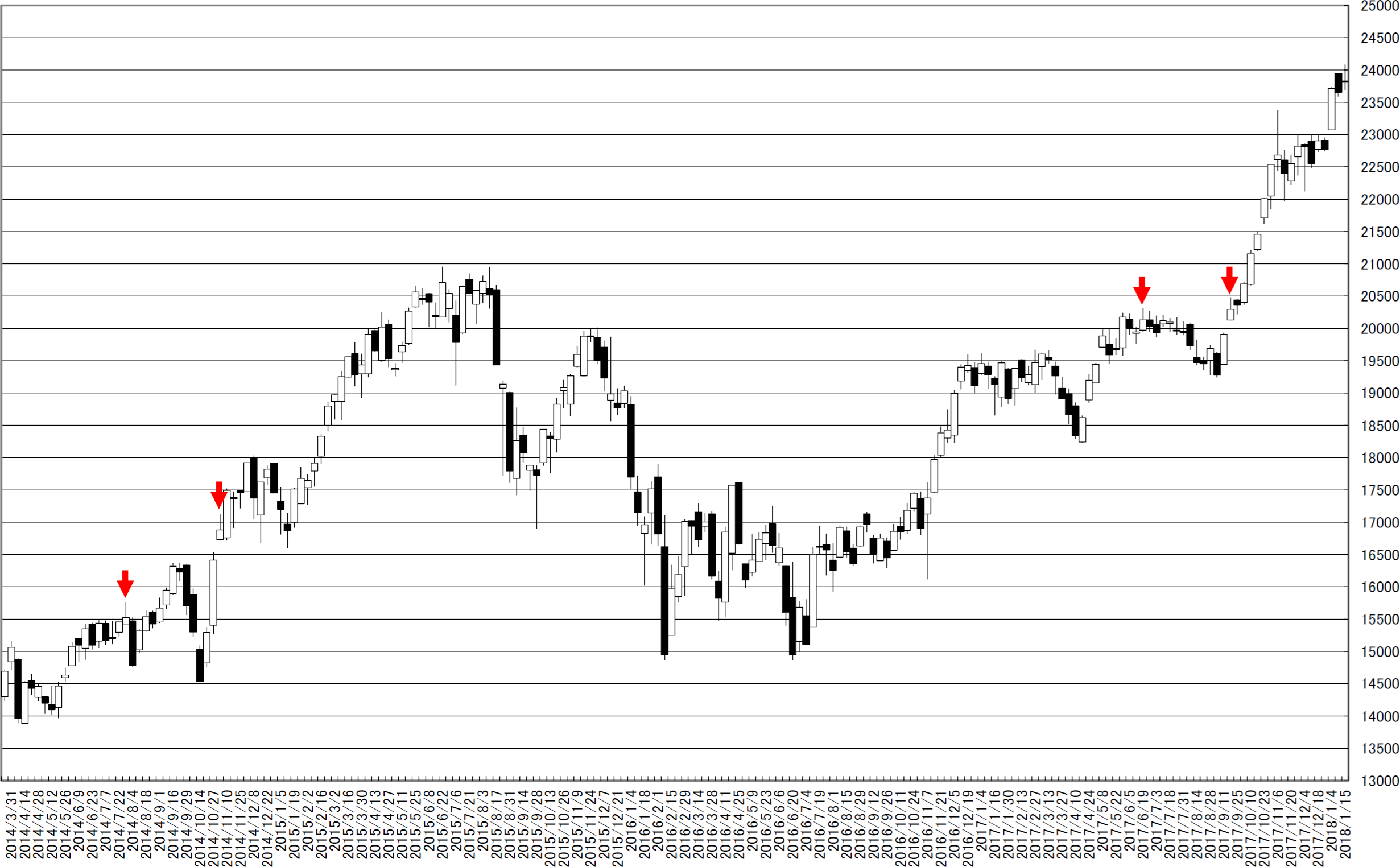 日経平均週足・羽黒6号線・ヒゲ抜きから高値追い