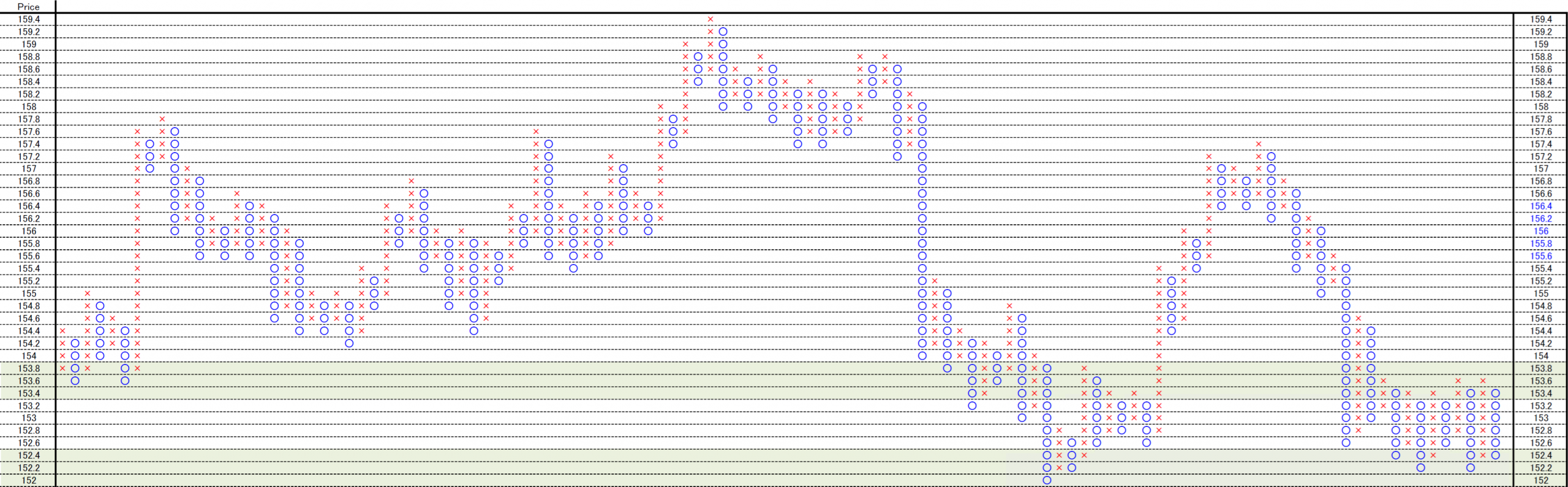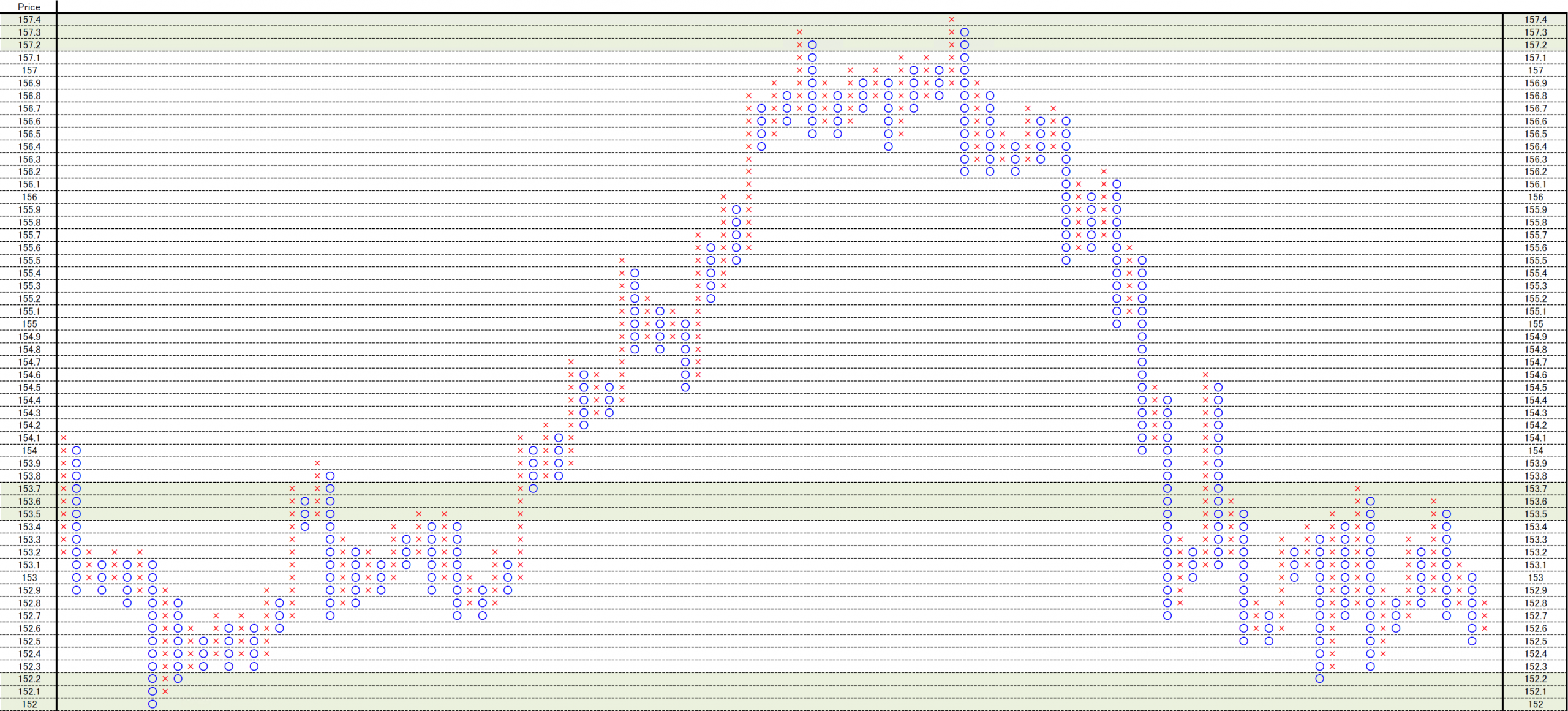 This is 0,1yen, 0.2yen and 1yen price change and 3 box reversal close price’s Point and Figure chart.
