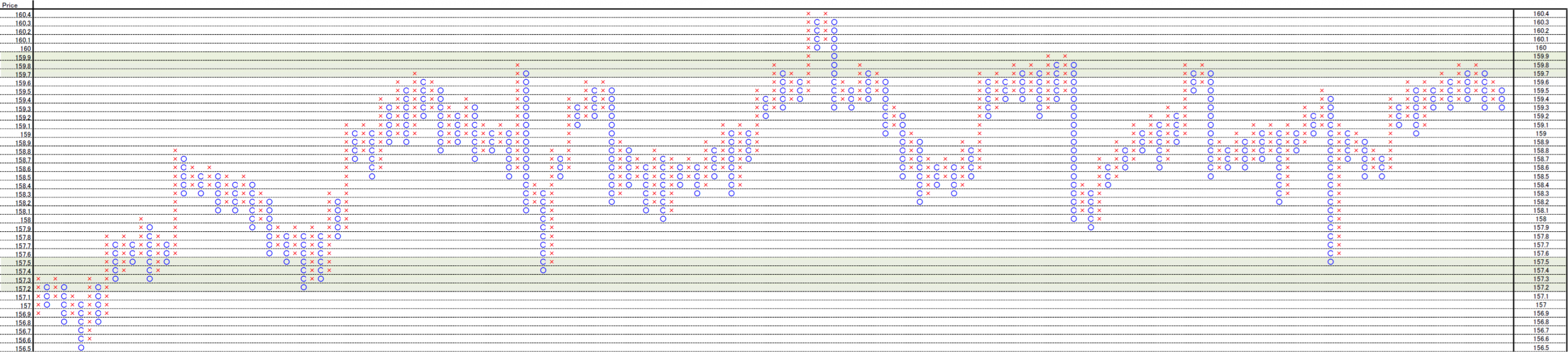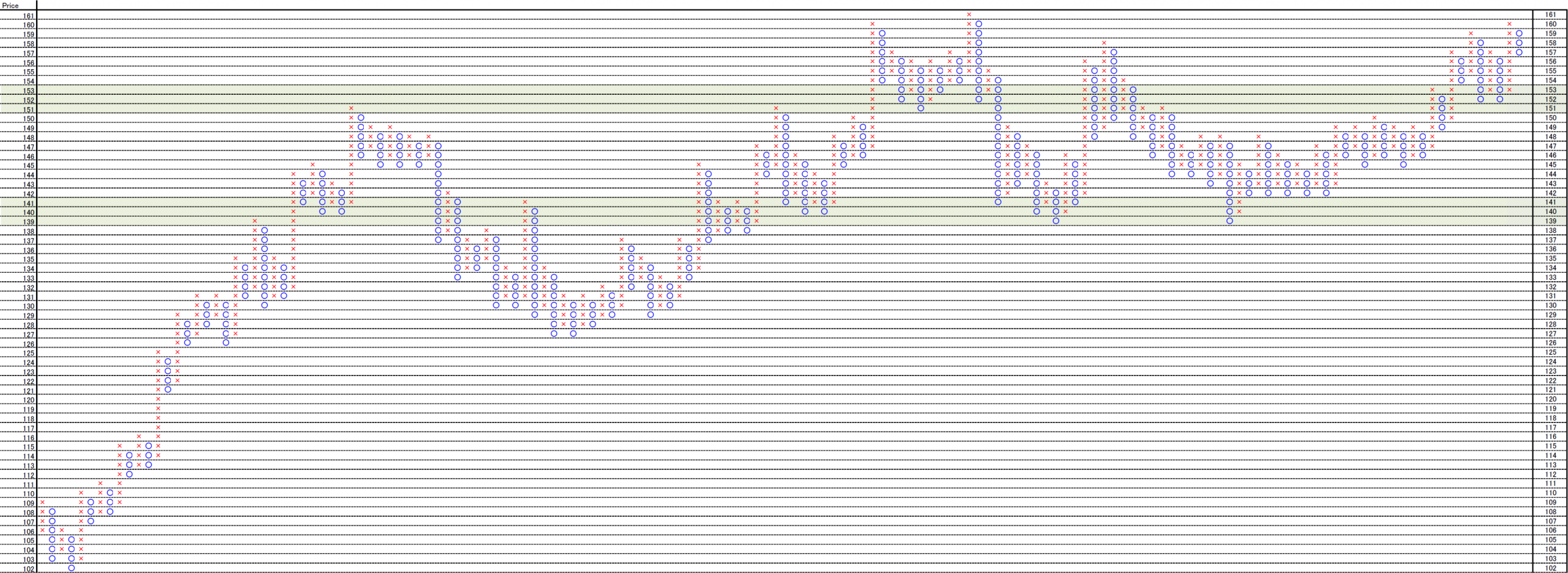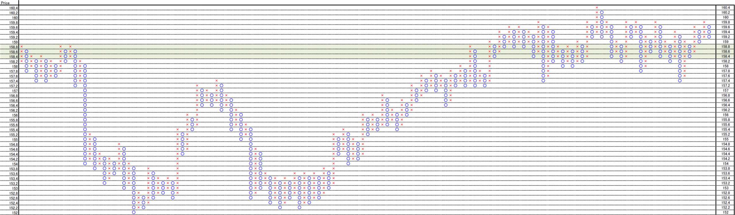 These are 0.1yen, 0.2yen and 1yen price change and 3 box reversal close price’s Point and Figure chart.